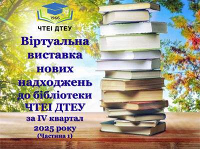 Запрошуємо ознайомитись з віртуальною виставкою друкованих видань, що надійшли до бібліотеки ЧТЕІ ДТЕУ у четвертому кварталі 2025 року (частина 1). Виставка містить фото, бібліографічні описи та анотації книг, які поповнили фонд бібліотеки. Ознайомитися з виставкою можна у розділі сайту «ВІРТУАЛЬНІ ВИСТАВКИ».