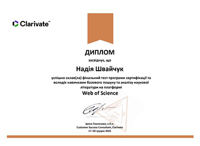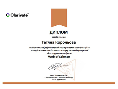 З 17 по 20 грудня 2025 року в Україні проходила щорічна програма сертифікації з Web of Science. Мета програми – вдосконалити навички базового і розширеного пошуку й аналізу наукової інформації у Web of Science. Співробітники бібліотеки ЧТЕІ ДТЕУ успішно пройшли тестування, набрали більше 75 балів і отримали дипломи програми сертифікації.