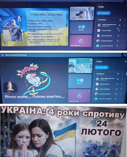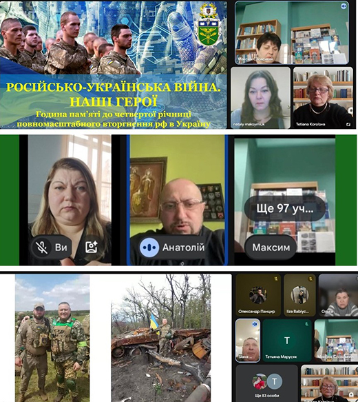 Онлайн-зустріч, приурочену до четвертої річниці повномасштабного вторгнення та дванадцятого року війни за незалежність України, відкрив директор інституту Анатолій Вдовічен. У своєму виступі він наголосив, що інститутська спільнота з перших днів війни активно підтримує українських захисників. Сьогодні ж особливо важливими залишаються волонтерська діяльність, виховання свідомої громадянської позиції студентської молоді та збереження пам’яті про тих, хто віддав життя за Україну.